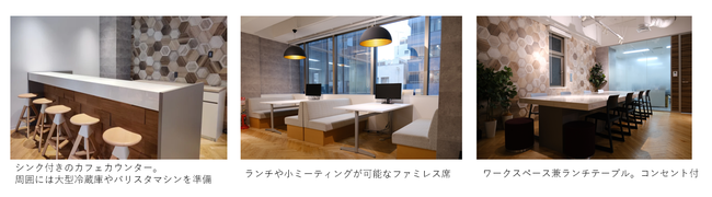 ラウンジと執務室の間に位置するカフェスペースは、ランチや休憩にちょうどよい空間です。冷蔵庫にはアルコールが常備され、終業後のコミュニケーション円滑化に役立ちます。