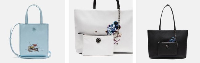 (写真中央と右) METROCITYのオリジナルアートワーク、ネオンカラーで描かれたミッキーマウスがスタイリッシュなトートバッグはブラック/ホワイトの2色展開。口に手を当てた笑顔のミッキーはとってもレア。大容量で荷物もたっぷり入る上、取り外し可能なポーチ付きです!(ミッキーマウス トートバッグMT4101(ホワイト、ブラック)¥37,950)(価格はすべて税込)