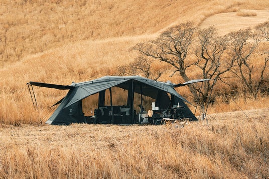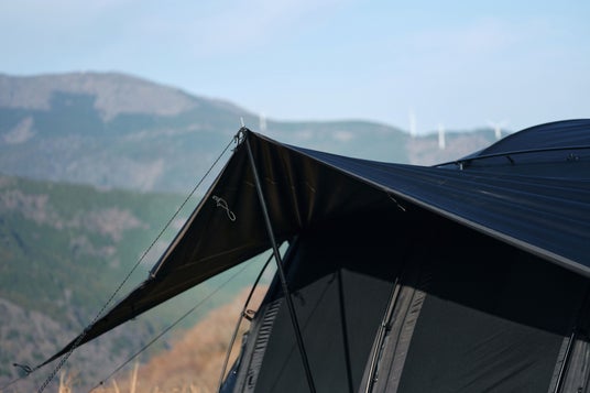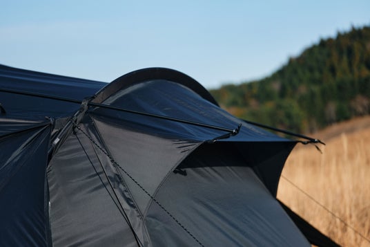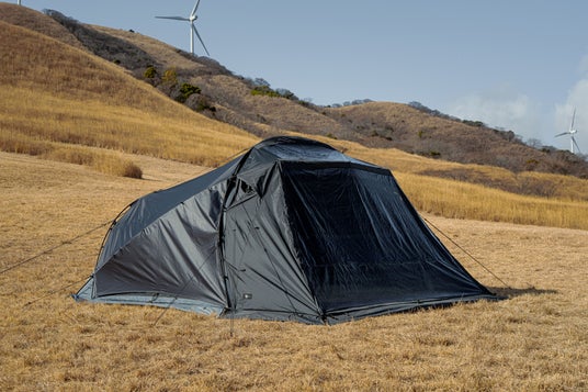 本モデルでは、天井をダブルレイヤー構造へとアップデート。耐水性・断熱性・結露対策といった居住性能を飛躍的に向上させました。さらに、通常モデルのグレーとは一線を画し、生地だけでなくポールや細部のパーツに至るまで、全身をブラックで統一した限定仕様を採用。加えて、5周年の証として、このモデルのためだけの特別なプリントロゴを施しています。