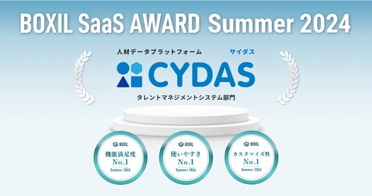 株式会社サイダス(本社:東京都港区、代表取締役:松田 晋、以下 サイダス)が提供する人材データプラットフォーム「CYDAS(サイダス)」が、スマートキャンプ株式会社(以下「スマートキャンプ」)が主催する「BOXIL SaaS AWARD Summer 2024」のタレントマネジメントシステム部門で「機能満足度No.1」「使いやすさNo.1」「カスタマイズ性No.1」に選出されました。