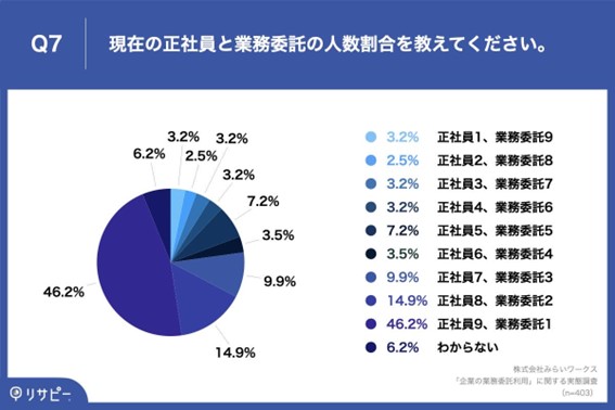 「Q7.現在の正社員と業務委託の人数割合を教えてください。」(n=403)と質問したところ、「正社員9、業務委託1」が46.2%、「正社員8、業務委託2」が14.9%という回答となりました。