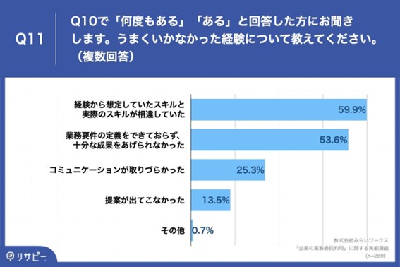 Q10で「何度もある」「ある」と回答した方に、「Q11.うまくいかなかった経験について教えてください。(複数回答)」(n=289)と質問したところ、「経験から想定していたスキルと実際のスキルが相違していた」が59.9%、「業務要件の定義をできておらず、十分な成果をあげられなかった」が53.6%、「コミュニケーションが取りづらかった」が25.3%という回答となりました。
