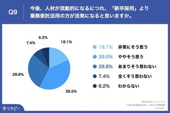 「Q9.今後、人材が流動的になるにつれ、「新卒採用」より業務委託活用の方が活発になると思いますか。」(n=403)と質問したところ、「非常にそう思う」が18.1%、「ややそう思う」が39.5%という回答となりました。
