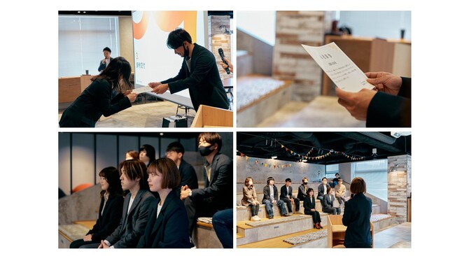 入社式では新入社員3名から決意表明を発表し、その様子を全社員へオンライン中継が行われたほか、代表取締役の上田をはじめとする役員がオフラインで出席し新入社員を歓迎しました。