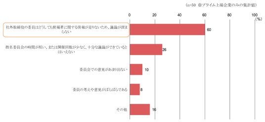 サクセッションの取り組みにおいて客観性や透明性を高めるためには、指名委員会や社外役員の適切な関与が求められます。指名委員会の課題としては「社外取締役の委員はどうしても候補者に関する情報が足りないため、議論が深まらない」が60%で最多であり、社外取締役が適切な関与を行うための情報共有について課題認識を持っていることが分かりました【図表4】。