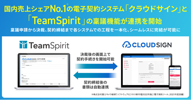 働き方改革プラットフォーム「TeamSpirit」シリーズを開発・提供する株式会社チームスピリット(代表取締役:荻島 浩司、 以下 チームスピリット)は、2023年1月19日(木)より「TeamSpirit」の稟議機能が、弁護士ドットコム社が提供する契約マネジメントプラットフォーム「クラウドサイン」と機能連携を開始することをお知らせいたします。