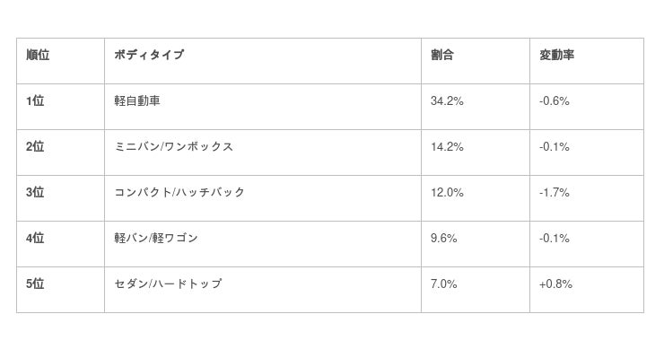 国産車のボディタイプ別ランキングでは、軽自動車が1位となりました。先月数値を伸ばしていたコンパクト/ハッチバックが1.7ポイント落としています。