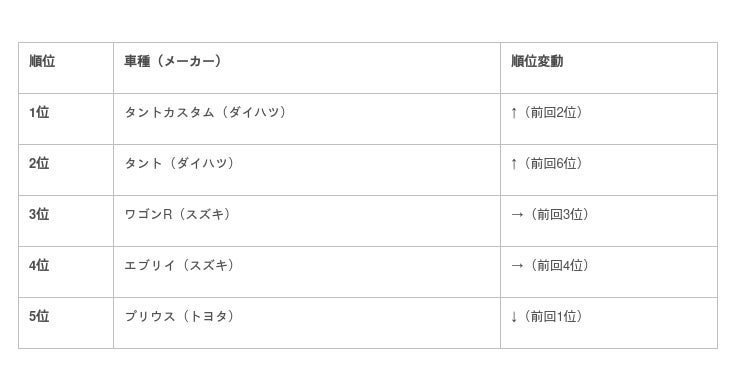 国産車の車種別ランキングではタントカスタム(ダイハツ)が1位となりました。ランキング10位以内での順位変動があるのみで、国産車の人気車種が固まっていることがわかります。