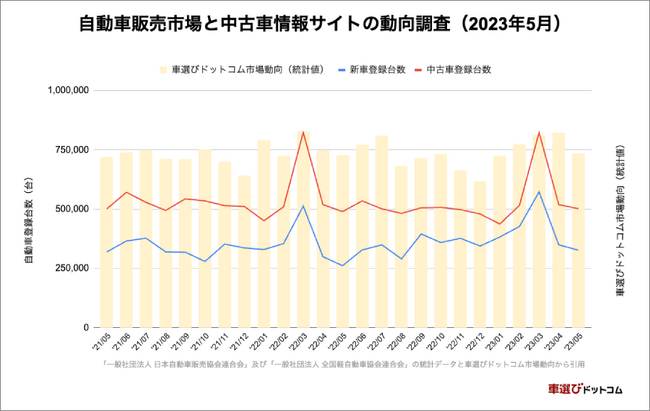 中古車情報サイト「車選びドットコム(https://www.kurumaerabi.com/)」を運営する株式会社ファブリカコミュニケーションズ(本社所在地:愛知県名古屋市中区、代表取締役社長:谷口 政人)より、2023年5月における自動車登録台数の推移と、中古車情報サイト「車選びドットコム」の販売台数推移から、中古車市場の動きをまとめたレポートをご案内いたします。
