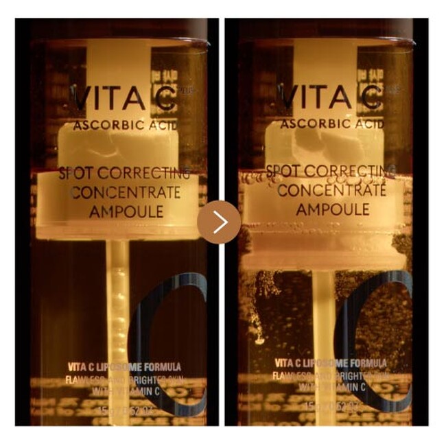 純度の高いビタミンC*¹ を鮮度よく保つため粉末タイプの生ビタミンC*¹を採用。使用開始のタイミングでポンプをカチッと押すと、上の層の生ビタミンC *¹パウダーが、下の層の液体層に溶け込みます。パウダーがすべて液体に溶け込むまでよく振って、液体と生ビタミンCパウダー*¹ をしっかり混ぜてご使用ください。さらに容器は新鮮な生ビタミンC*¹ を守るため、遮光性を考慮したデザインを採用しています。