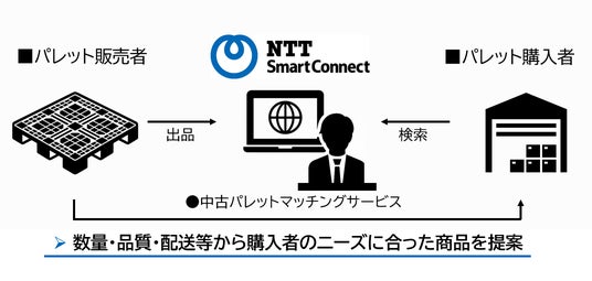 このような課題の解決に向けて、NTTスマートコネクトは、中古パレット販売ニーズと購入ニーズのマッチングを支援する売買プラットフォームの有用性の実証実験を開始します。