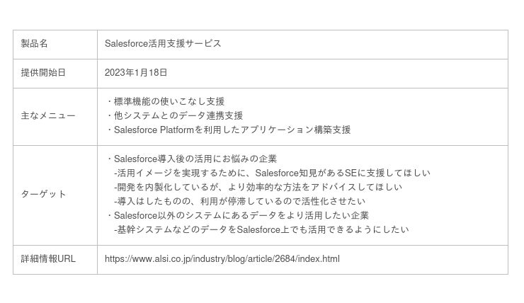アルプス システム インテグレーション株式会社(本社:東京都大田区、代表取締役社長:永倉 仁哉、以下ALSI〔アルシー〕)は、このたび株式会社セールスフォース・ジャパンが提供するクラウド型ビジネスアプリケーション「Salesforce」による「Salesforce活用支援サービス」の提供を開始いたします。