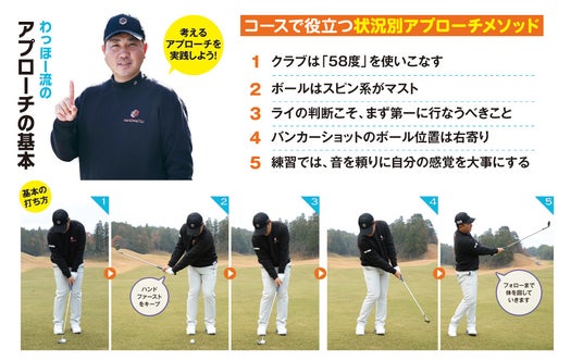 本書では、初心者から上級者まで実際のラウンドで役立つアプローチ技術を詳しく解説しています。多くのゴルファーは、どうしても形にこだわって練習をすることが多いのですが、わっほー流のアプローチの土台はその人の感性を大切にすることです。練習場でも打球の「音」を頼りに、1ヤード練習など、YouTube動画で話題のアプローチ練習法も紹介しています。