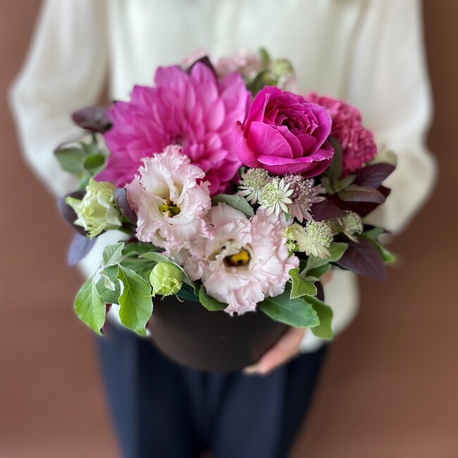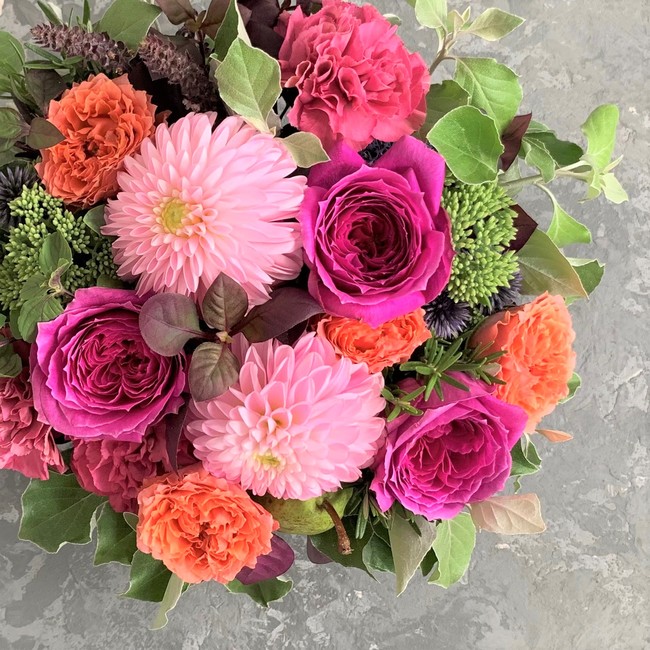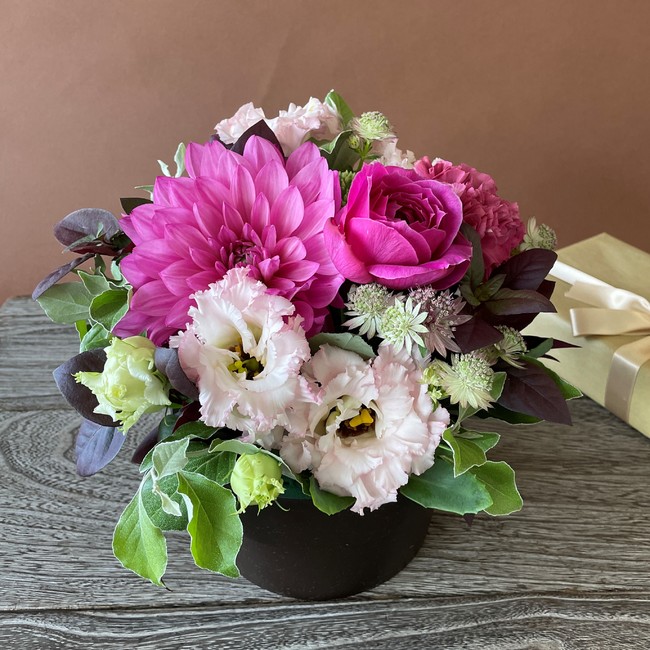 感謝の花言葉を持つ旬の花、ダリアを使ったアレンジメント。
