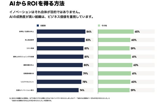企業のAI投資は今後も増加が見込まれ、AI先駆者は特に高いリターンを得ていることが明らかになりました。調査では、AI先駆者の84%がAI導入によって効率性や生産性が向上したと回答しており、これはその他の企業(65%)を大きく上回っています。