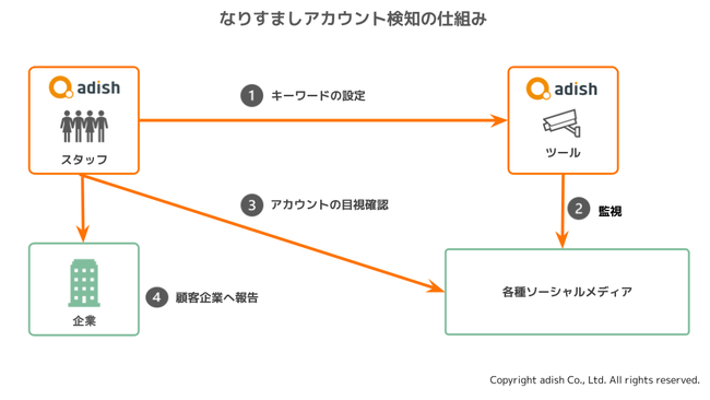 アディッシュの「なりすましチェッカー」は、企業アカウントになりすました偽のSNSアカウントを見つけるために、Facebook、Instagram、Twitter(※2)などのSNSサービスをアディッシュ独自のツールと専任の担当者でパトロールします。