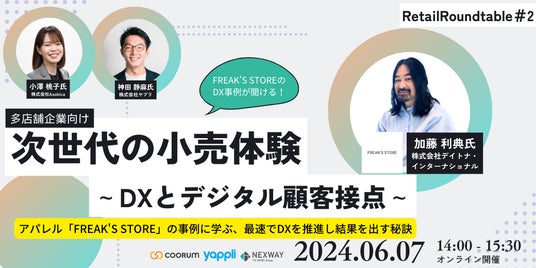 株式会社Asobica(本社所在地:東京都品川区、代表取締役CEO:今田 孝哉)は、株式会社ネクスウェイ(本社所在地:東京都江東区、代表取締役社長:松森 正彦)が主催する、6月7日(金)開催「Retail Roundtable#2次世代の小売体験~DXとデジタル顧客接点~」に登壇します。