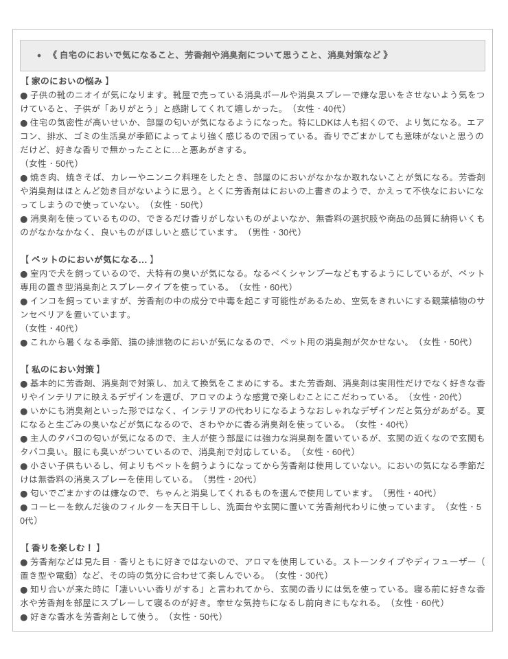 最後に、自宅のにおいで気になることや、芳香剤・消臭剤について思うことなどを自由に書いてもらいました。玄関やキッチンといったにおいの発生しやすい場所での悩みや、かわいいペットであっても、においが気になる人は多いようでした。また、「芳香剤のにおいが苦手」という声も聞かれ、そのために消臭剤を使っている人も少なくないようです。アロマや香水を芳香剤代わりにして香りを楽しむ人もいるように、香りにはリラックスや気分転換の効果があります。におい対策としての活用はもちろん、自分の好みの香りを見つけてみるのも楽しいかもしれませんね。