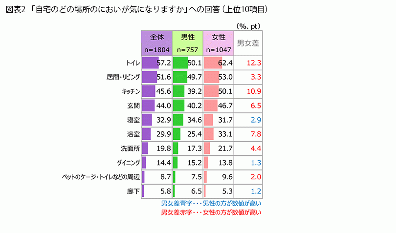 【自宅のどの場所のにおいが気になるか】も聞いてみました(図表2)。57.2%と最多だったのが「トイレ」というのは納得ですね。以下、家族が集まる「居間・リビング」51.6%、料理でにおいが発生する「キッチン」45.6%、靴などにおいの発生源になるアイテムがある「玄関」44.0%と続きました。水回りの「浴室」「洗面所」が各29.9%・19.8%となっていますが、排水溝のにおいが気になる人が多いのでしょうか。男女別では、10ポイント超の差がついた「トイレ」「キッチン」をはじめ全般に女性が上回っていますが、リラックス空間の「寝室」や「ダイニング」では男性のほうが高値となりました。「ペットのケージ・トイレなどの周辺」は全体では8.7%にとどまりますが、“室内で犬” “室内で猫”を飼っている人では各30.8%・34.2%(図表非掲示)と、図表1とは逆の結果となりました。