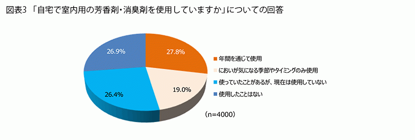 自宅のにおい対策として、簡単かつ安価なのが芳香剤や消臭剤を置くことでしょう。自宅で室内用の芳香剤・消臭剤を使っているかを聞いたところ(図表3)、「年間を通じて使用」27.8%、「においが気になる季節やタイミングのみ使用」19.0%という結果に。芳香剤・消臭剤を常用もしくはスポット的に使用している人は46.8%となり、意外と少ない印象です。「使っていたことがあるが、現在は使用していない」も26.4%に。“気になるにおいが消えなかった”のか、“好みの香りの商品が見つからなかった”のか、理由が気になるところです。「使用したことがない」も、常用者とほぼ同率の26.9%となりました。