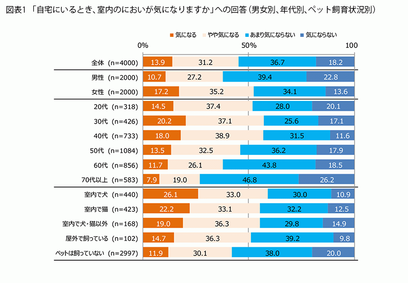 まずは、【自宅のにおいの気になり度】をたずねてみました(図表1)。“気になる派”(「気になる」+「やや気になる」)と“気にならない派”(「あまり気にならない」+「気にならない」)でみると、45.1%vs 54.9%で“気にならない派”がやや優勢ですが、これを属性別にみると少し様相が変わってきます。男女別では“気になる派”は男性37.9%vs女性52.4%と女性が14.5ポイント高値に。女性のほうがにおいに敏感という結果に。年代別では、子育て世代の30・40代で各57.3%・56.9%と全体より10ポイント超上回り、特に同年代の女性では各60.5%・61.4%と高値を示しました(図表非掲示)。30・40代を頂点に“気になる派”が低下し、70代以上では26.9%にまで縮小するのも興味深いところです。