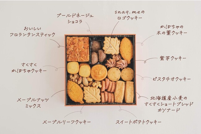 フレーバーは秋を感じるさつまいもやかぼちゃをメインに、缶を開けた際、森を思い出させるようなメープルの葉や落ち葉の形のクッキー、ナッツを使ったおやつを敷きつめました。