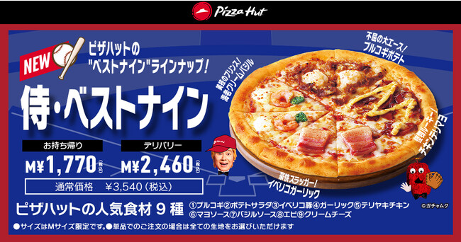 30種類以上もあるピザハットのトッピングの中から選ばれた、“ピザハットのベストナイン”である、プルコギ、ポテトサラダ、イベリコ豚、ガーリック、テリヤキチキン、マヨソース、バジルソース、エビ、クリームチーズの9種を1枚のピザでお楽しみいただけます。「不屈の大エース!プルコギポテト」「怪物ルーキー!チキンテリマヨ」「豪快スラッガー!イベリコガーリック」「美技のプリンス!海老クリームバジル」により構成された夢の布陣をご賞味ください。