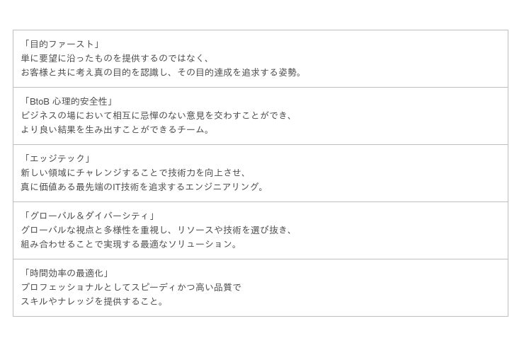「1 年以上前、変化の激しい市場の中でケイパビリティを発揮し続け、組織も大きくなってもこれまで以上に高い品質のサービスを提供するために、改めて自社の目指す姿を見つめ直しました。再確認したことは、揺るぎない価値を生み出すために必要なのは何か、ということです。十分な時間をかけて、我々を我々たらしめる根底の部分から再構築しました。新しいビジョン、ミッション、バリューを心に刻み、お客様やパートナー企業、そして社員と夢を実現して行きたいと思います。」