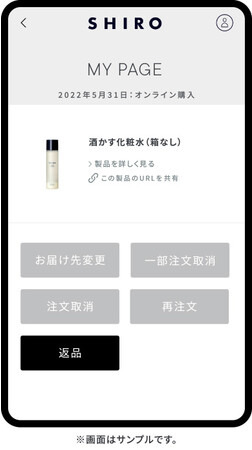 SHIROオンラインストアマイページ内、「注文・特典履歴」ページよりご返品の申請を行ってください。