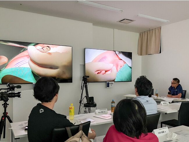 当日は、座学と手術見学の2部構成で開催。座学では、5名の医師による発表・講演が行われました。手術見学では、全員が手技を見学し適宜質問ができるよう、手術室と研修室のモニター・音声をつなげて手術を実施。TCB特別指導医 兼 二重整形指導最高責任者(東北)兼 TCB仙台駅前院 院長を務め、「美容外科医が教える二重整形ココだけの話」の著者でもある安本匠医師が重瞼術の手術手技の知見を共有しました。