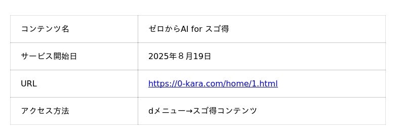 株式会社ピアズ(本社:東京都港区、代表取締役社長:桑野隆司、以下当社)は、株式会社NTTドコモ(以下ドコモ)との業務提携により、ドコモが提供するスマートフォン向けサービス「スゴ得コンテンツ(R)」※1において、生成AIを活用した個人向けリスキリング支援サービス『ゼロからAI for スゴ得』を、2025年8月より提供開始いたします。