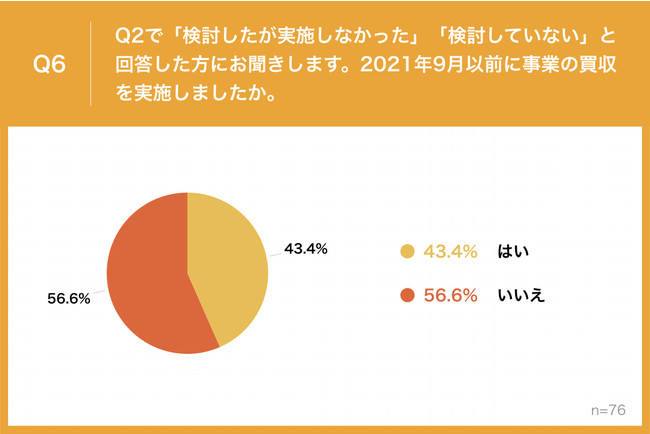Q2で「検討したが実施しなかった」「検討していない」と回答した方に、「Q6.2021年9月以前に事業の買収を実施しましたか。」(n=76)と質問したところ、「はい」が43.4%、「いいえ」が56.6%という回答となりました。
