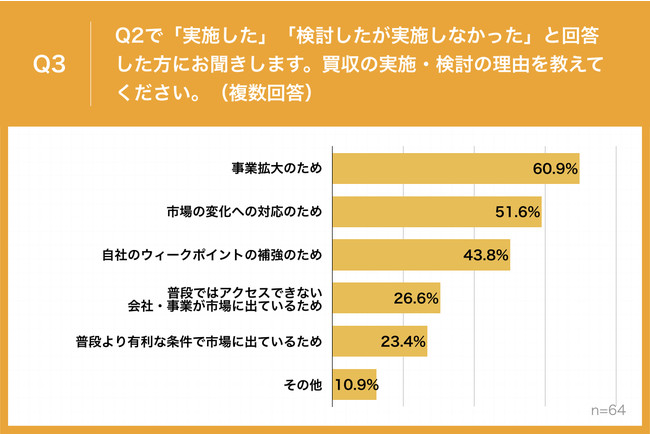 Q2で「実施した」「検討したが実施しなかった」と回答した方に、「Q3.買収の実施・検討の理由を教えてください。(複数回答)」(n=64)と質問したところ、「事業拡大のため」が60.9%、「市場の変化への対応のため」が51.6%、「自社のウィークポイントの補強のため」が43.8%という回答となりました。