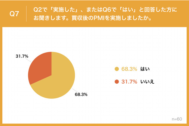 Q2で「実施した」、またはQ6で「はい」と回答した方に、「Q7.買収後のPMIを実施しましたか。」(n=60)と質問したところ、「はい」が68.3%、「いいえ」が31.7%という回答となりました。