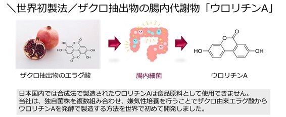 ウロリチンAは、ザクロやベリー類、ナッツ類などに含まれるエラグ酸が腸内細菌の働きで代謝され生成する腸内代謝物で、2016年にオートファジーの1種であるマイトファジー促進作用が学術誌Nature Medicineに報告され、注目を集めている機能性成分です。