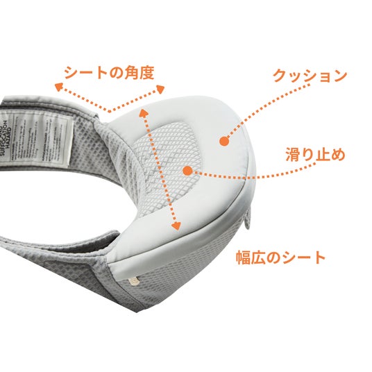 抱っこされたお子さまが快適な姿勢を保てるように設計されたシート。やわらかいクッションと滑り止め付きの座面で、お子さまの姿勢をサポート。ゆったりと幅広に作られているので、お子さまが大きくなってからも快適にお使いいただけます。