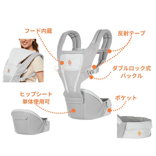 基本の対面抱きに加え、前向き抱きやおんぶも可能。バックパネルを取り外してヒップシート単体で使用することもできるため、お子さまの成長や使用場面に合わせて使い分けができます。