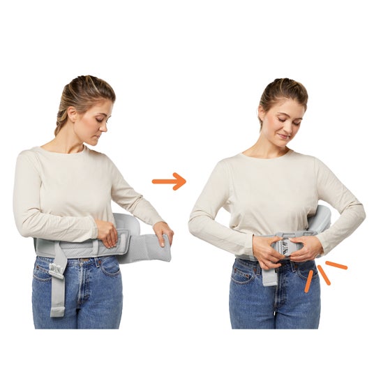 ウエストベルトはバックルを留めるだけのシンプルな設計。バックルを留めた後に締め具合を調整できるので、体にピタッとフィットします。着脱テープがないため、大きな音を立てず付け外しでき、お子さまが眠った後の抱き降ろしもスムーズ。服を巻き込む心配もありません。