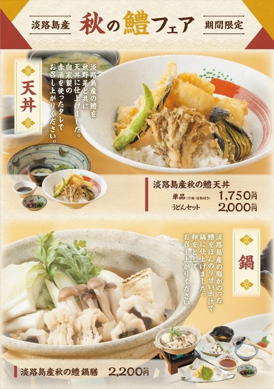 淡路島の玄関口に位置し、明石海峡大橋を眺めながら旬の食材を味わえるレストランや、特産品のショッピングを楽しめる淡路ハイウェイオアシス(運営:ユーアールエー株式会社/所在地:兵庫県淡路市岩屋)の、オアシス館2Fお食事処メインダイニングのレストラン「みけ家」では、2024年9月10日(火)より淡路島産秋の鱧フェアを開催します。「淡路島産秋の鱧鍋膳」と「淡路島産秋の鱧天丼」が季節限定で新登場します。