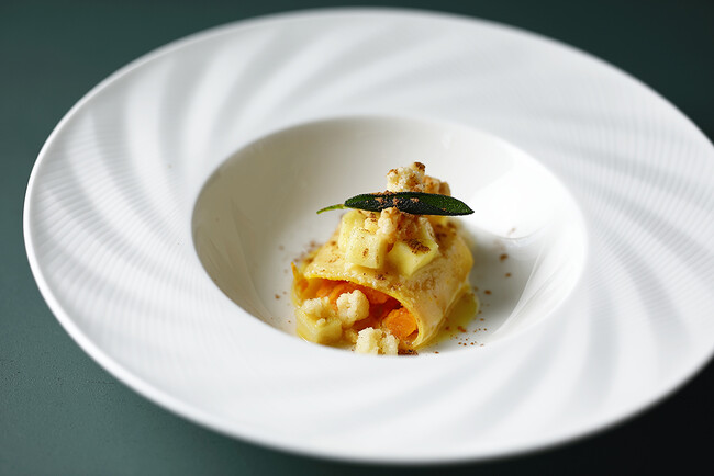 【温前菜】バターナッツカボチャのカネロニ リンゴのモスタルダ パルメザンチーズの香り *優秀作品