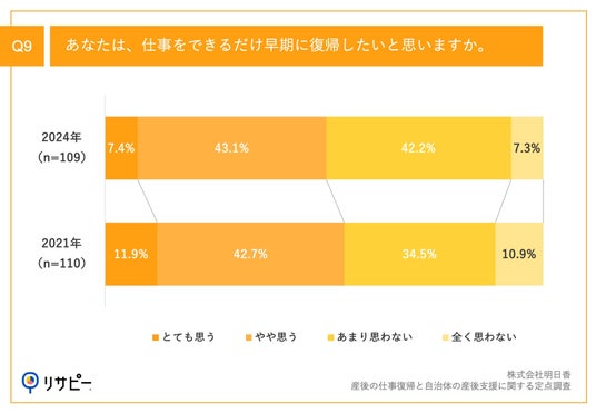「Q9.あなたは、仕事をできるだけ早期に復帰したいと思いますか。」(n=109)と質問したところ、「とても思う」が7.4%、「やや思う」が43.1%という回答となりました。