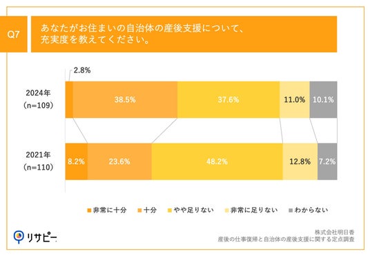 「Q7.あなたがお住まいの自治体の産後支援について、充実度を教えてください。」(n=109)と質問したところ、「やや足りない」が37.6%、「非常に足りない」が11.0%という回答となりました。