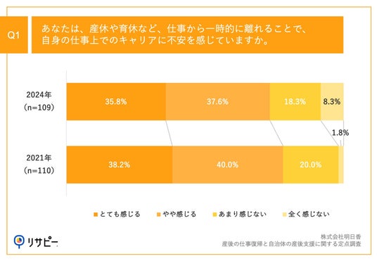 「Q1.あなたは、産休や育休など、仕事から一時的に離れることで、自身の仕事上でのキャリアに不安を感じていますか。」(n=109)と質問したところ、「とても感じる」が35.8%、「やや感じる」が37.6%という回答となりました。