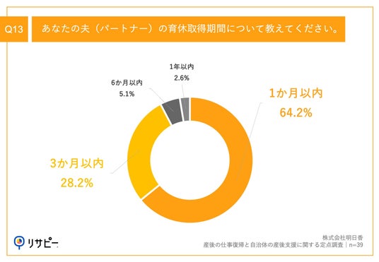 Q11で「現在取得している」「過去に取得したことがある」と回答した方に、「Q13.あなたの夫(パートナー)の育休取得期間について教えてください。」(n=39)と質問したところ、「1か月以内」が64.2%、「3か月以内」が28.2%という回答となりました。