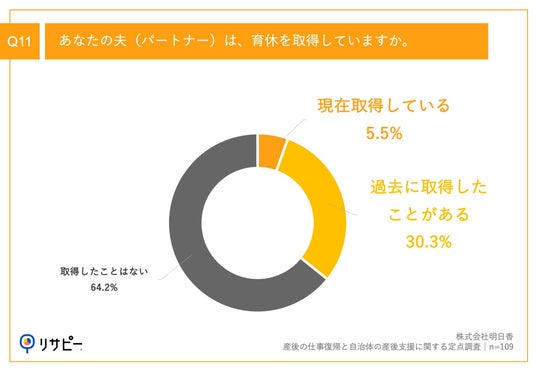 「Q11.あなたの夫(パートナー)は、育休を取得していますか。」(n=109)と質問したところ、「現在取得している」が5.5%、「過去に取得したことがある」が30.3%という回答となりました。