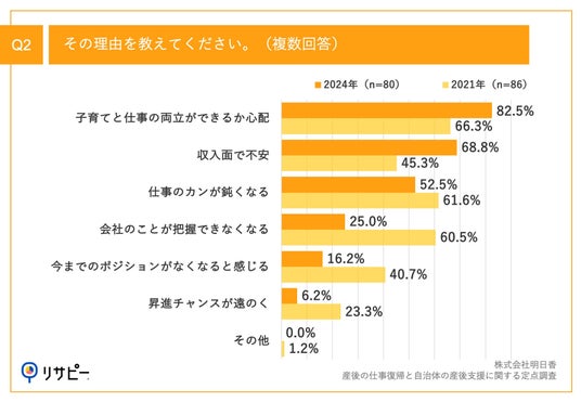 Q1で「とても感じる」「やや感じる」と回答した方に、「Q2.その理由を教えてください。(複数回答)」(n=80)と質問したところ、「子育てと仕事の両立ができるか心配」が82.5%、「収入面で不安」が68.8%、「仕事のカンが鈍くなる」が52.5%という回答となりました。