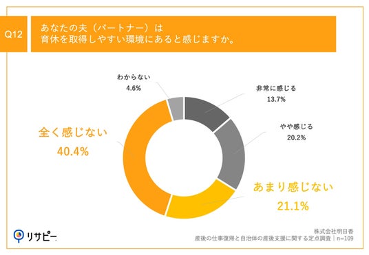 「Q12.あなたの夫(パートナー)は育休を取得しやすい環境にあると感じますか。」(n=109)と質問したところ、「全く感じない」が40.4%、「あまり感じない」が21.1%という回答となりました。
