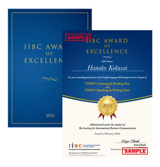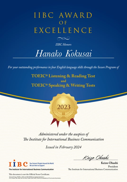 日本でTOEIC Programを実施・運営する国際ビジネスコミュニケーション協会(IIBC)(所在地:東京都千代田区永田町、理事長:大橋圭造)は、英語の「聞く」「読む」技能を測定するTOEIC Listening & Reading公開テストと、「話す」「書く」技能を測定するTOEIC Speaking & Writing公開テストにおいて、基準のスコアを取得された方を「IIBC AWARD OF EXCELLENCE」受賞者とし、表彰状をお贈りしています。この賞には、年齢問わず、幅広いバックグラウンドの方々に挑戦いただいており、8回目となる2023年は538名が受賞しました。