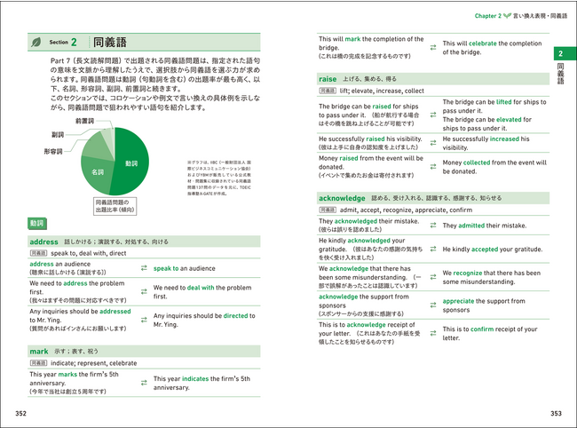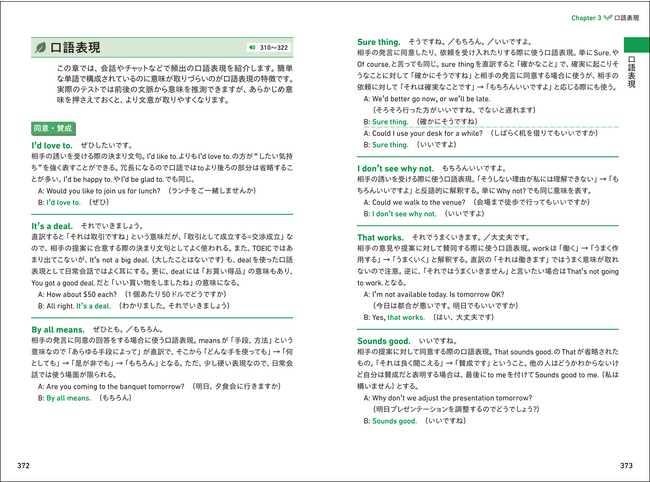 「Chapter 2 言い換え表現・同義語」では、「上位語・下位語」、「パラフレーズ(語句の言い換え)」、「同義語」の3つの切り口で、言い換えパターンを網羅しています。さらに「Chapter 3 口語表現」では、112の「口語表現」を使用場面別に収録しており、スコアアップに役立ちます。