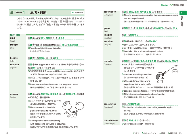 「Chapter 1 単語・熟語」では、TOEIC(R) L&Rテストに頻出する単熟語を共通性・関連性の観点でセクションごとにグループ化して掲載しています。つながりを意識しながら、意味のまとまりで関連付けて覚えられるので、学習効率が良いだけでなく、語句の深い理解につながります。